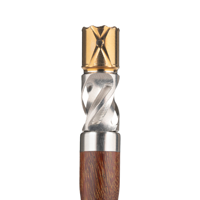 The WoodWynd's slim ergonomic stem design provides a comfortable grip, while its adjust-a-bowl feature in the Helix Tip allows for microdosing. The thicker chamber walls ensure an even roast of your herb, and it fits snugly with 10mm water pieces, even without a taper.